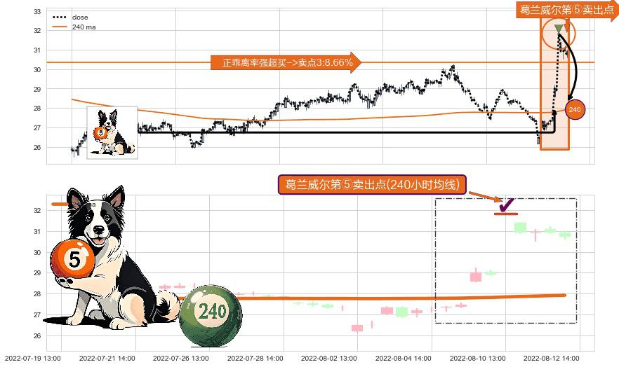 形态多维评估: ⚀ 2022-08-10 13:00:00-小时显现 葛兰威尔均线 240小时均线 第⑤卖出点 上升趋势均值回复的短线回落信号,后市看跌,卖出信号