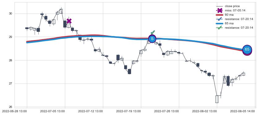 下跌趋势06-28 13:00-08-05 14:00,均线65, 60确认关键阻力1处