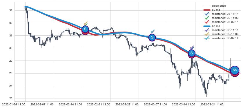 下跌趋势01-24 11:00-03-22 13:00,均线65, 60确认关键阻力3处