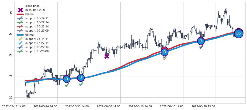 上涨趋势05-18 14:00-07-07 13:00,均线65, 60确认关键支撑4处