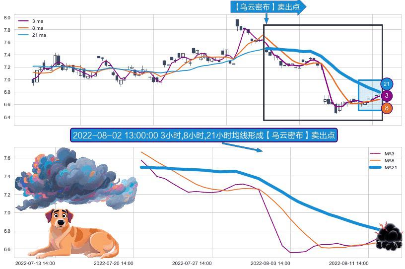 ⚀ 2022-07-21 13:00:00小时-2022-08-12 14:00:00小时显现 3小时-8小时-21小时均线 【乌云密布】卖出点 看空信号,后市看跌,卖出