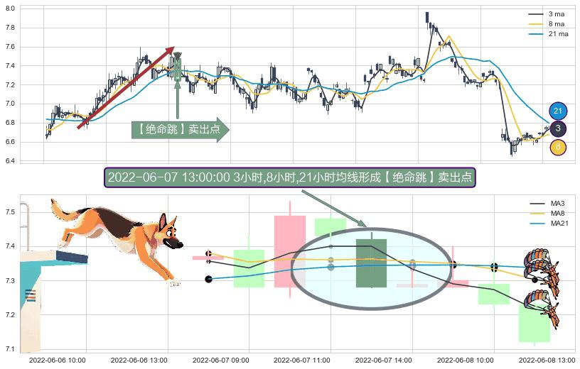 ⚀ 2022-06-07 13:00:00小时显现 3小时-8小时-21小时均线 【绝命跳】卖出点 看空信号,后市看跌,卖出
