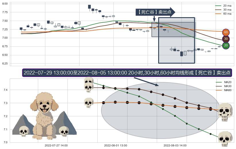 ⚀ 2022-07-29 14:00:00-小时至2022-08-05 13:00:00-小时显现 20小时-30小时-60小时均线 【死亡谷】卖出点 看空信号,后市看跌,卖出