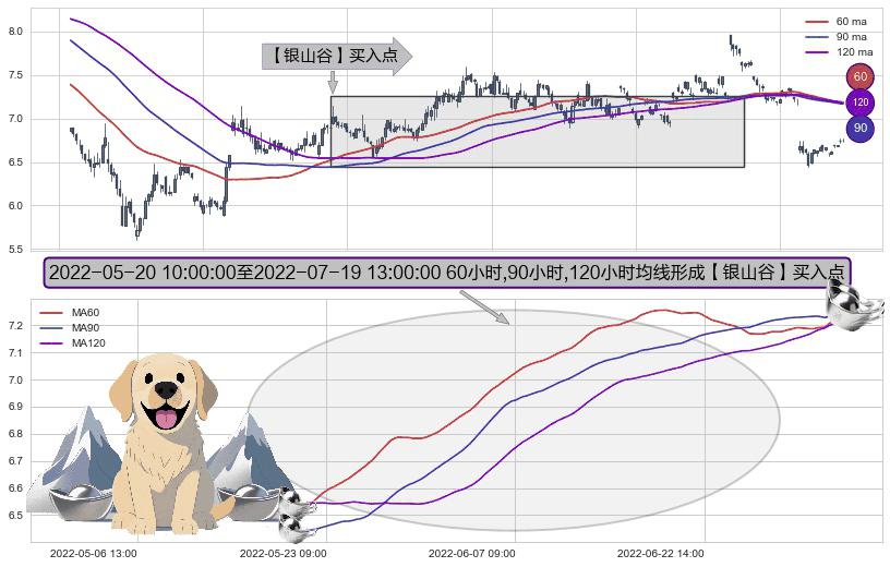 ⚀ 2022-05-20 11:00:00-小时至2022-07-19 13:00:00-小时显现 60小时-90小时-120小时均线 【银山谷】买入点 看多信号,后市看涨,买入