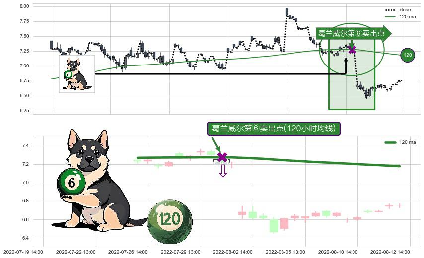 ⚀ 2022-08-01 13:00:00-小时显现 葛兰威尔均线 120小时均线 第⑥卖出点 走势反转见顶信号,后市看跌,卖出信号