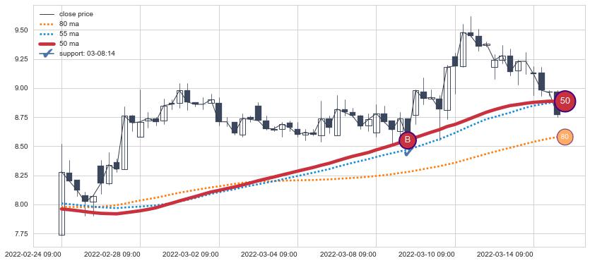 ⚁ MA3和MA8走势平行,且始终保持在短距离内,MA21始终在短中期均线上方,与短中期均线保持一定的距离,微微下行