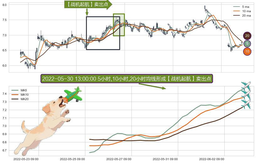 ⚀ 2022-05-25 10:00:00小时-2022-06-02 14:00:00小时显现 5小时-10小时-20小时均线 【战机起航】卖出点 看空信号,后市看跌,卖出