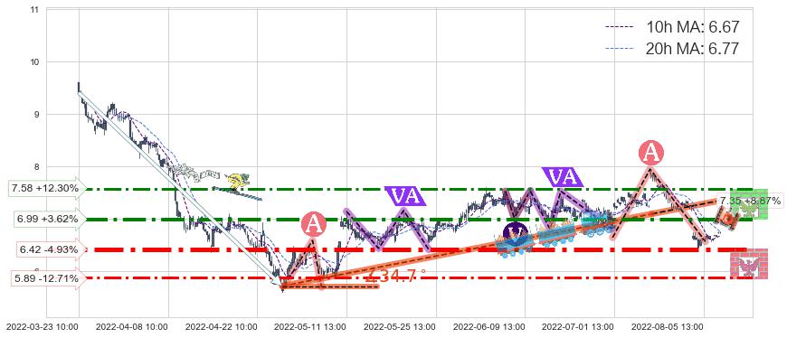 ✂️ 2022-04-27 09:00-2022-07-15 14:00上升趋势存在反转[风险],其原上升趋势的支撑位(7.35)已破位[强阻力信号],原上升趋势角度: 34.7˚