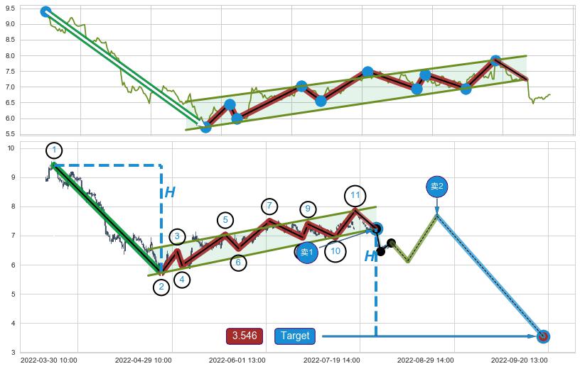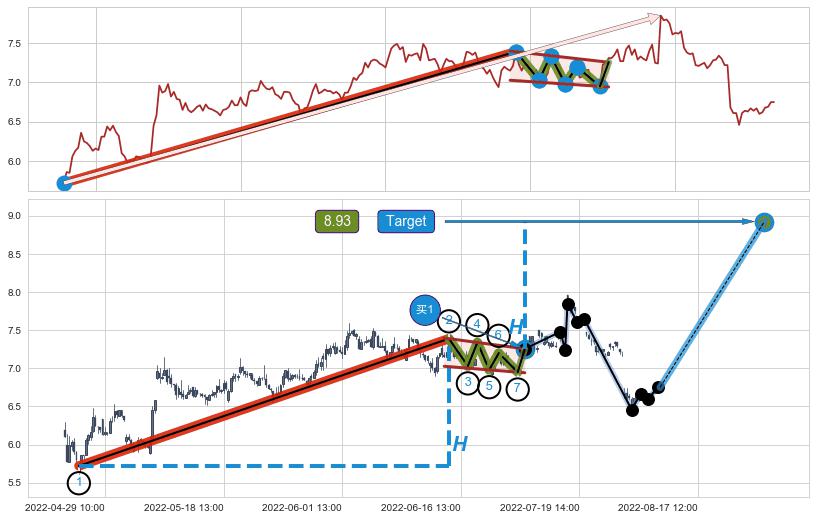 ➣ D点拟合预测价格8.61,距离最后交易收盘价格6.75相差 +27.61%