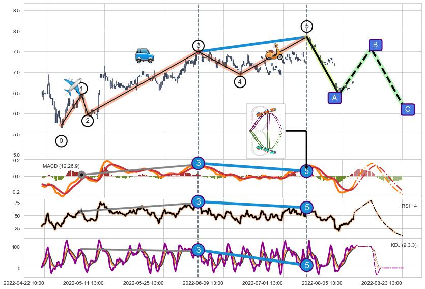 ➣ 1,3,5驱动浪MACD, RSI, KDJ走势都出现【常规背离】反转信号增强