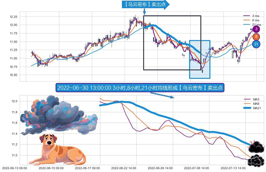 形态多维评估: ⚀ 2022-06-17 09:00:00小时-2022-07-14 14:00:00小时显现 3小时-8小时-21小时均线 【乌云密布】卖出点 看空信号,后市看跌,卖出
