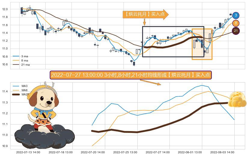 形态多维评估: ⚀ 2022-07-19 14:00:00小时-2022-08-03 14:00:00小时显现 3小时-8小时-21小时均线 【烘云托月】买入点 看多信号,后市看涨,买入