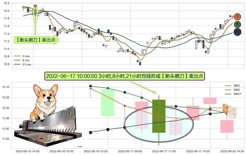 形态多维评估: ⚀ 2022-06-17 10:00:00小时显现 3小时-8小时-21小时均线 【断头铡刀】卖出点 看空信号,后市看跌,卖出