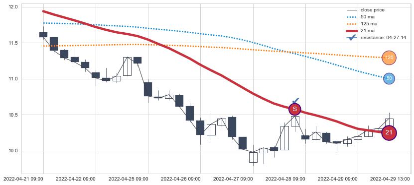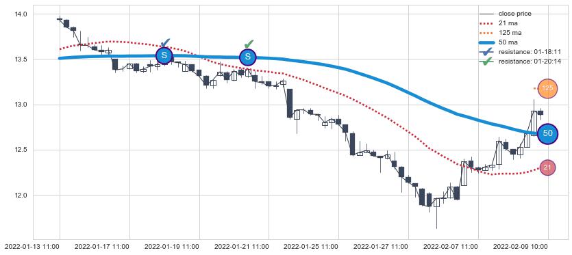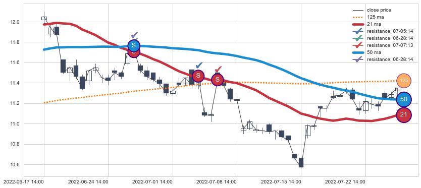 下跌趋势06-17 14:00-07-27 13:00,均线50, 21确认关键阻力3处