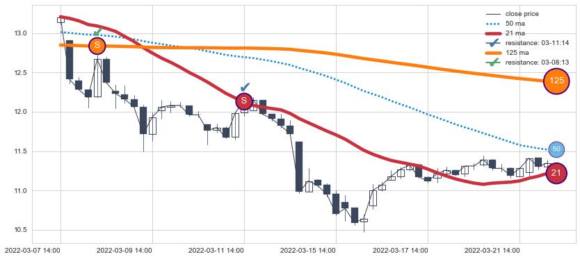 下跌趋势03-07 14:00-03-22 11:00,均线125, 21确认关键阻力2处