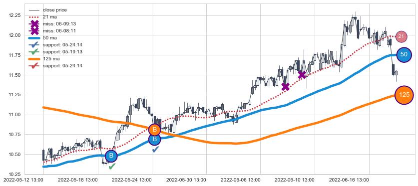 上涨趋势05-12 13:00-06-21 14:00,均线50, 125确认关键支撑2处