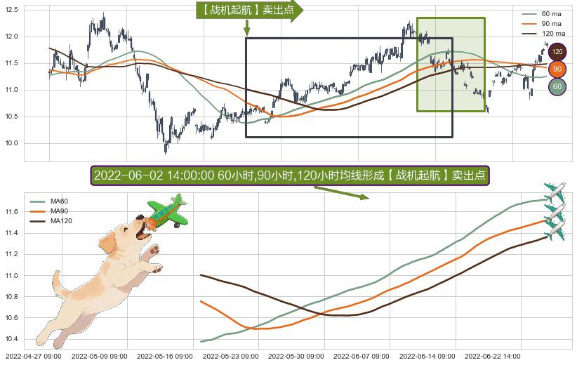 形态多维评估: ⚀ 2022-05-16 13:00:00小时-2022-06-29 14:00:00小时显现 60小时-90小时-120小时均线 【战机起航】卖出点 看空信号,后市看跌,卖出