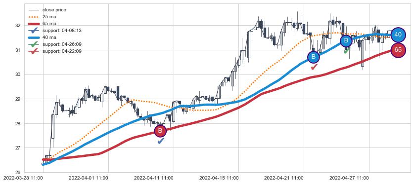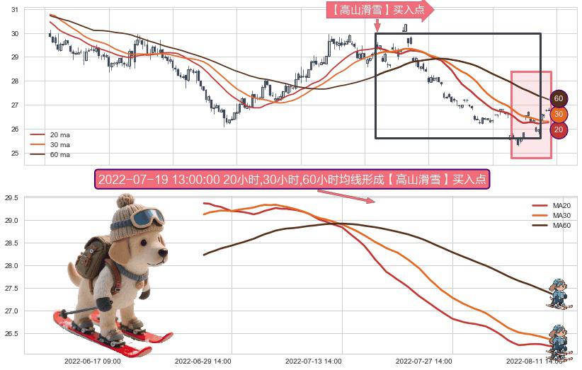 ⚀ 2022-06-27 13:00:00小时-2022-08-10 14:00:00小时显现 20小时-30小时-60小时均线 【高山滑雪】买入点 看多信号,后市看涨,买入