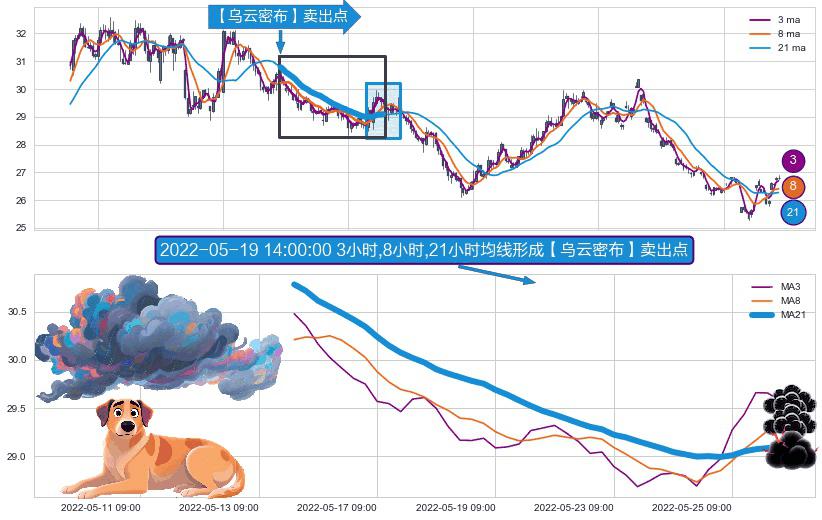 ⚀ 2022-05-13 13:00:00小时-2022-05-25 14:00:00小时显现 3小时-8小时-21小时均线 【乌云密布】卖出点 看空信号,后市看跌,卖出