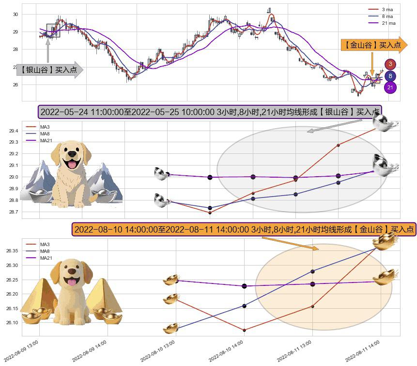 ⚀ 2022-08-11 13:00:00-小时至2022-08-11 14:00:00-小时显现 3小时-8小时-21小时均线 【金山谷】买入点 其再次确认了买入信号,可靠性更强,买入