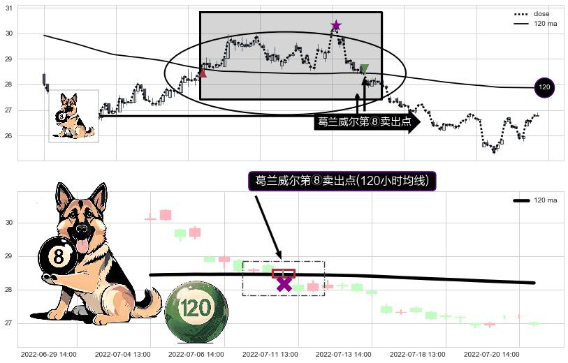 ⚀ 2022-07-08 14:00:00-小时显现 葛兰威尔均线 120小时均线 第⑧卖出点 下降趋势的中继信号,后市看跌,卖出信号