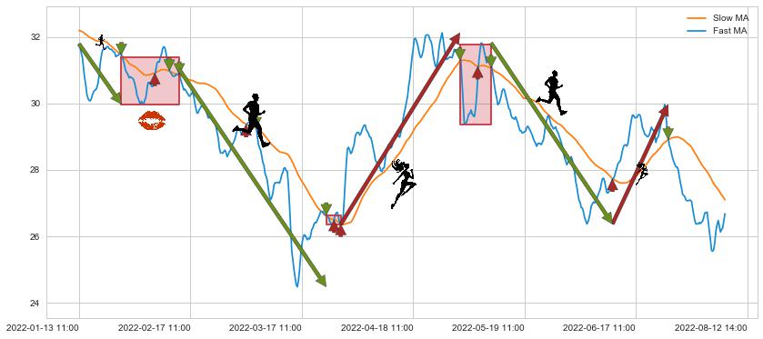 04-28 14:00至05-11 11:00 慢线与快线多次接触,存在上下穿越,有缠绕
