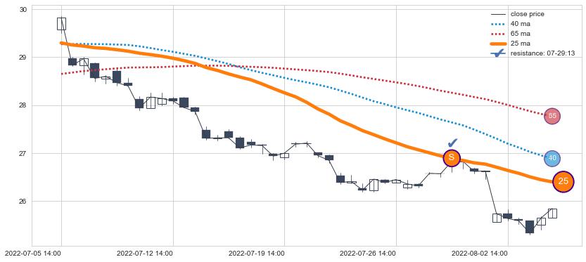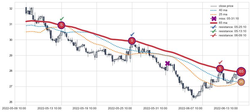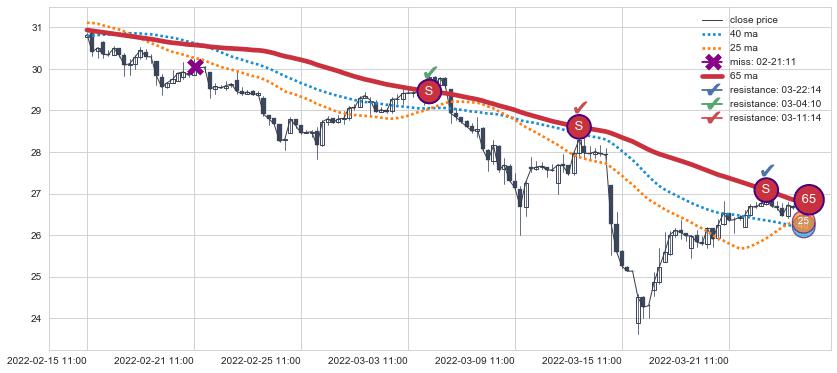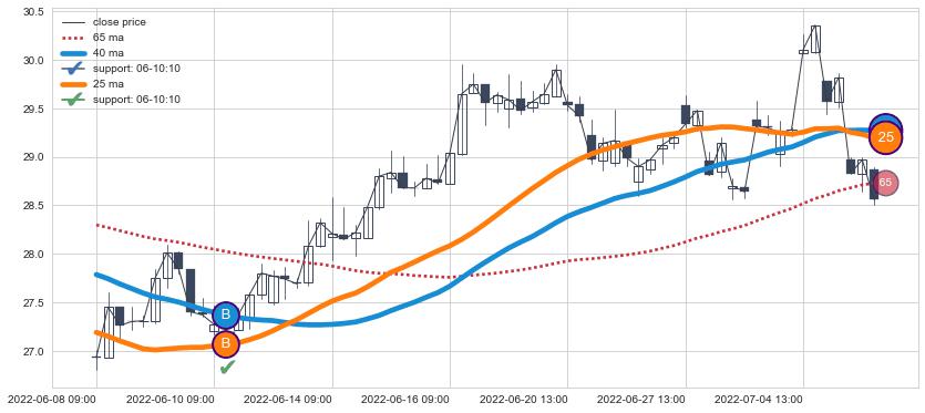 ⚂ 2022-06-14 14:00:00-小时均线向上突破,2022-07-08 14:00:00-小时重新下穿均线破位,均线阻力再次生效