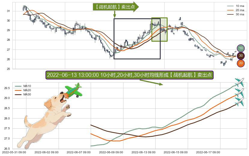 ⚀ 2022-06-07 09:00:00小时-2022-06-20 13:00:00小时显现 10小时-20小时-30小时均线 【战机起航】卖出点 看空信号,后市看跌,卖出