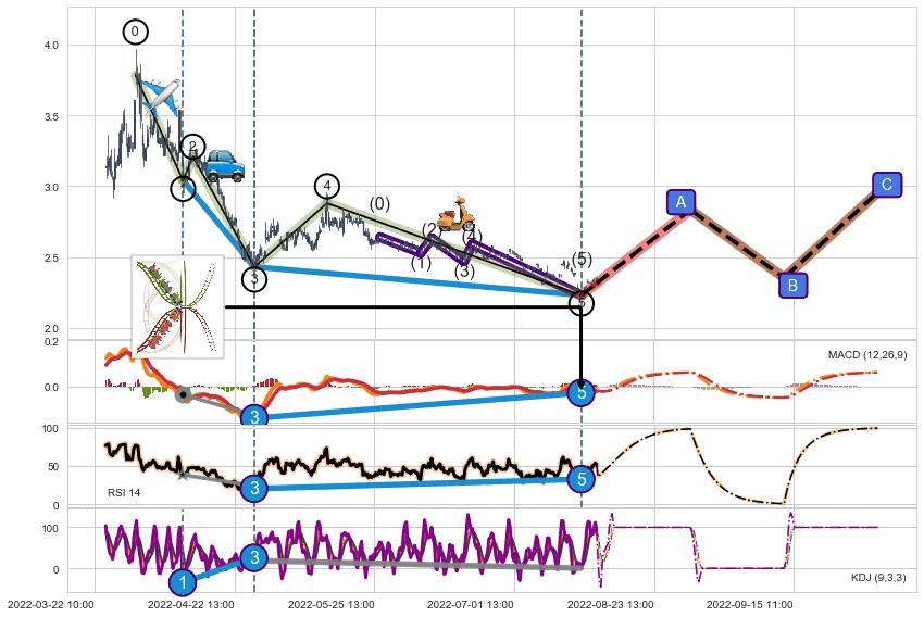 ➣ 1,3,5驱动浪MACD, RSI, KDJ走势都出现【常规背离】反转信号增强