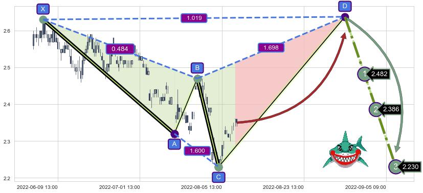 ➣ D点拟合预测价格2.637,距离最后交易收盘价格2.350相差 +12.23%