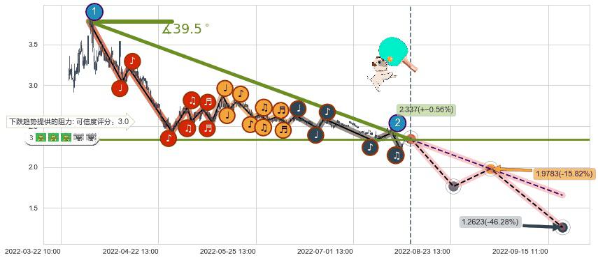 ♘ 在最后的下跌阶段2022-03-31 09:00至2022-08-12 13:00,存在 破位边缘的阻力位 ,阻力价格2.337,可信任强度73.61%,其距离最后价格2.350相差 -0.56%