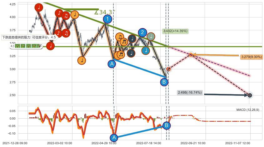 ♘ 在最后的下跌阶段2022-01-11 11:00至2022-08-12 14:00,存在 持续未破位的阻力位 ,阻力价格3.432,可信任强度87.36%,其距离最后价格3.000相差 +14.39%