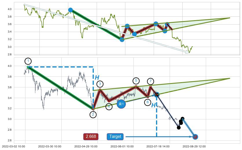 ➢ 最小中继整理跌幅→𝐇: 0.7900 (𝐇楔型旗杆的长度:楔型起点→顶点)