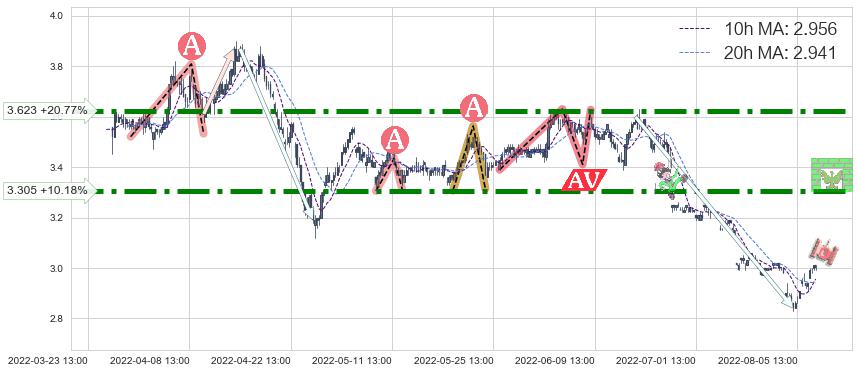 ♘ 阻力价格位3.305,可信任强度89.85%,距离最后交易2022-08-12 14:00形成的收盘价格3.000相差 +10.18%