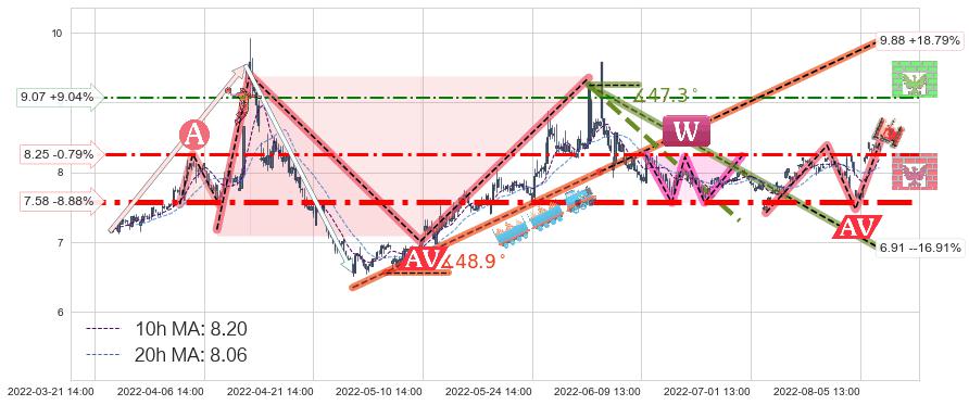 ♘ 支撑价格位7.58,可信任强度94.17%,距离最后交易2022-08-12 14:00形成的收盘价格8.32相差 -8.88%