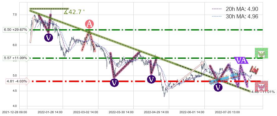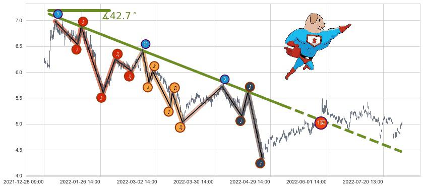 ⚔️ 2021-12-29 14:00-2022-05-11 10:00下跌趋势存在反转上涨[机会],其原下跌趋势的阻力位(4.46)已被突破[强支撑信号],原下跌趋势角度: 42.7˚