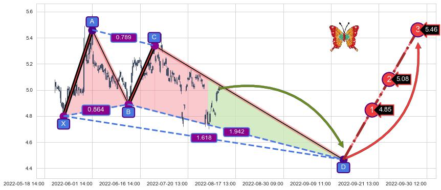 ➣ 未完成【蝴蝶】形态起点X: 05-24:14, 已到达C点: 06-24:14, 预测最终D点: 09-13:12, 共282交易小时