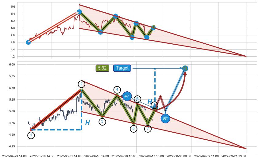 ➢ 最小中继整理涨幅→𝐇: 0.8600 (𝐇楔型旗杆的长度:楔型起点→顶点)