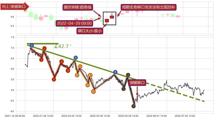➣ 2021-12-29 14:00-2022-05-11 10:00下跌趋势存在反转上涨[机会],其原下跌趋势的阻力位(4.46)已被突破[强支撑信号],原下跌趋势角度: 42.7˚