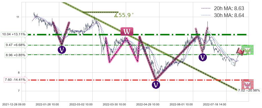 ♘ 支撑价格位7.60,可信任强度56.29%,距离最后交易2022-08-12 14:00形成的收盘价格8.88相差 -14.41%