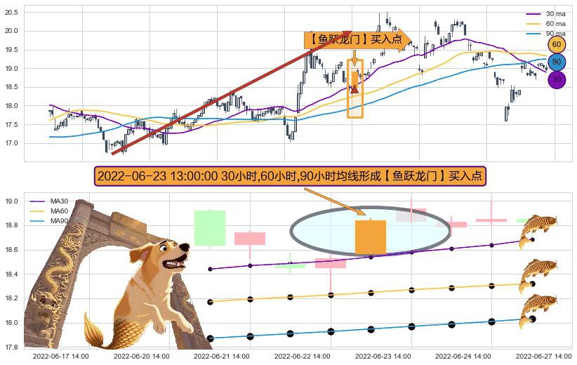⚀ 2022-06-23 13:00:00小时显现 30小时-60小时-90小时均线 【鱼跃龙门】买入点 看多信号,后市看涨,买入