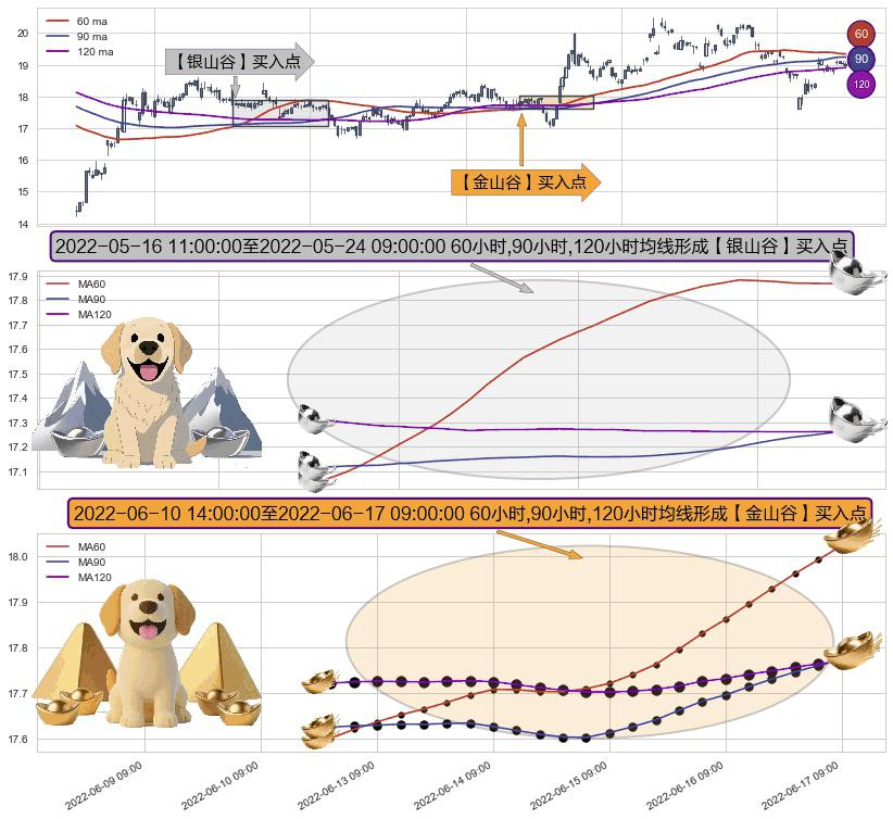 ⚃ 2022-06-13 09:00:00-小时至2022-06-17 09:00:00-小时显现 60小时-90小时-120小时均线 【金山谷】买入点 其再次确认了买入信号,可靠性更强,买入