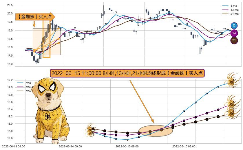 ⚀ 2022-06-15 11:00:00小时显现 8小时-13小时-21小时均线 【金蜘蛛】买入点 看多信号,后市看涨,买入