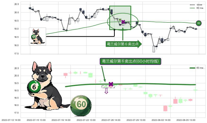 ⚀ 2022-07-25 13:00:00-小时显现 葛兰威尔均线 60小时均线 第⑥卖出点 走势反转见顶信号,后市看跌,卖出信号