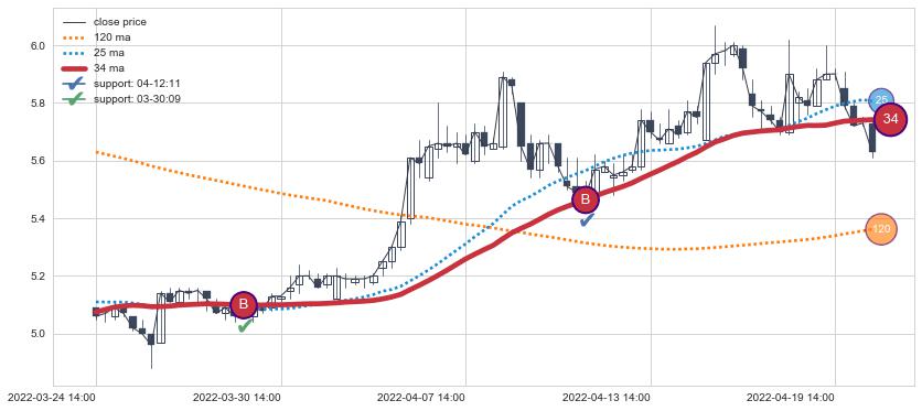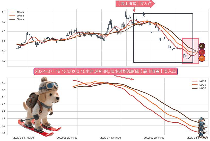 ⚀ 2022-06-28 14:00:00小时-2022-08-09 14:00:00小时显现 10小时-20小时-30小时均线 【高山滑雪】买入点 看多信号,后市看涨,买入