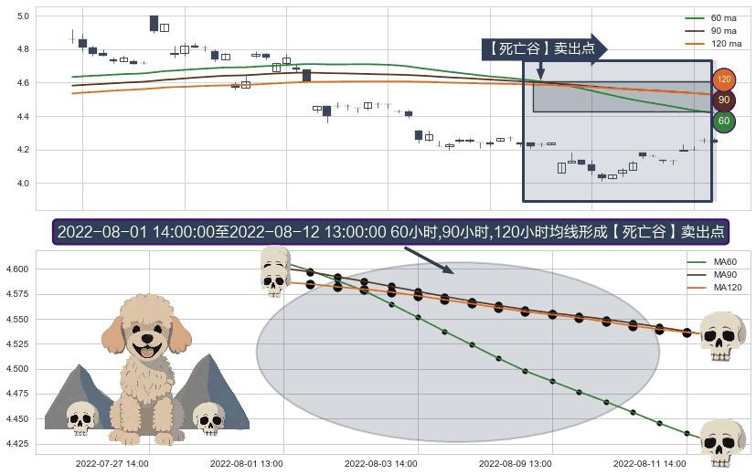 ⚀ 2022-08-02 13:00:00-小时至2022-08-12 13:00:00-小时显现 60小时-90小时-120小时均线 【死亡谷】卖出点 看空信号,后市看跌,卖出