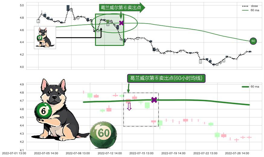 ⚀ 2022-07-13 13:00:00-小时显现 葛兰威尔均线 60小时均线 第⑥卖出点 走势反转见顶信号,后市看跌,卖出信号