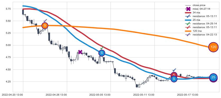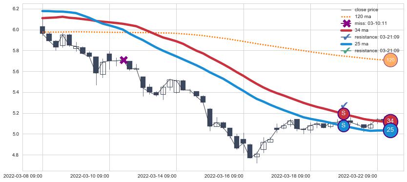 ⚂ 2022-06-22 13:00:00-小时均线向上突破,2022-07-14 14:00:00-小时重新下穿均线破位,均线阻力再次生效