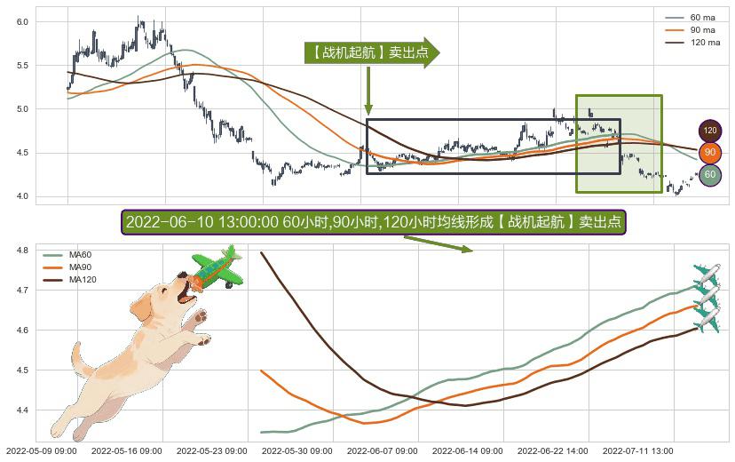 ⚀ 2022-05-23 14:00:00小时-2022-07-14 14:00:00小时显现 60小时-90小时-120小时均线 【战机起航】卖出点 看空信号,后市看跌,卖出