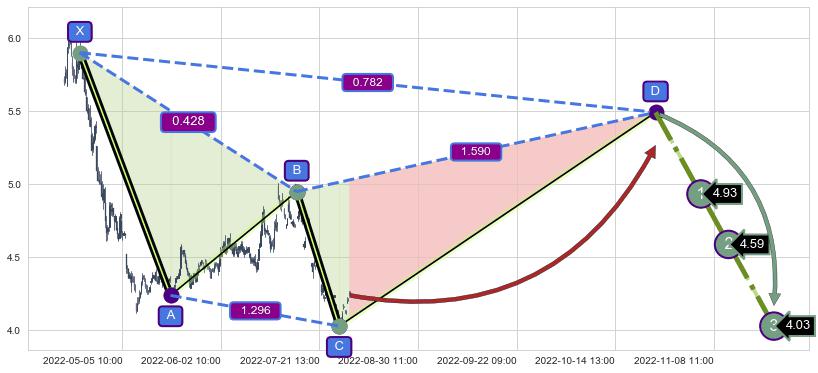 ➣ D点拟合预测价格5.49,距离最后交易收盘价格4.24相差 +29.54%